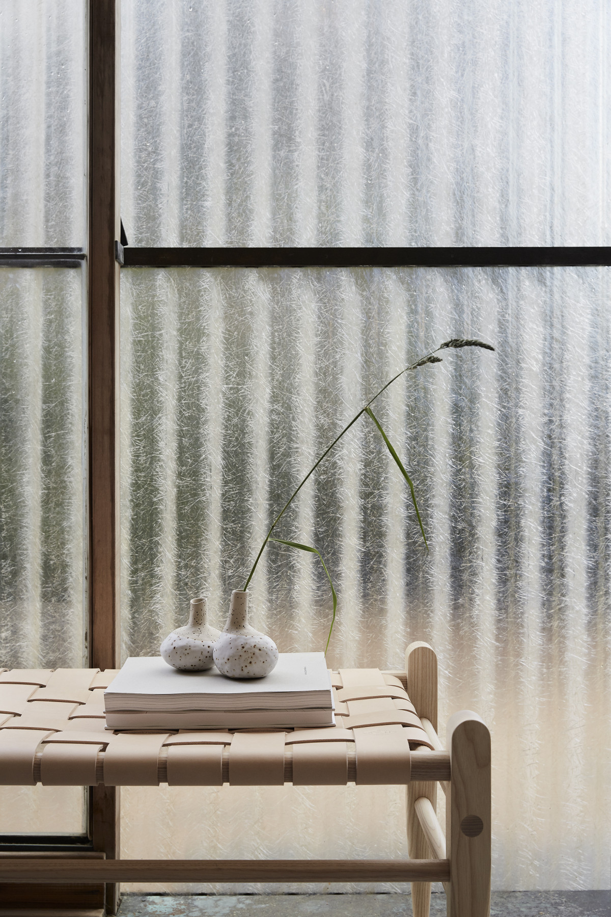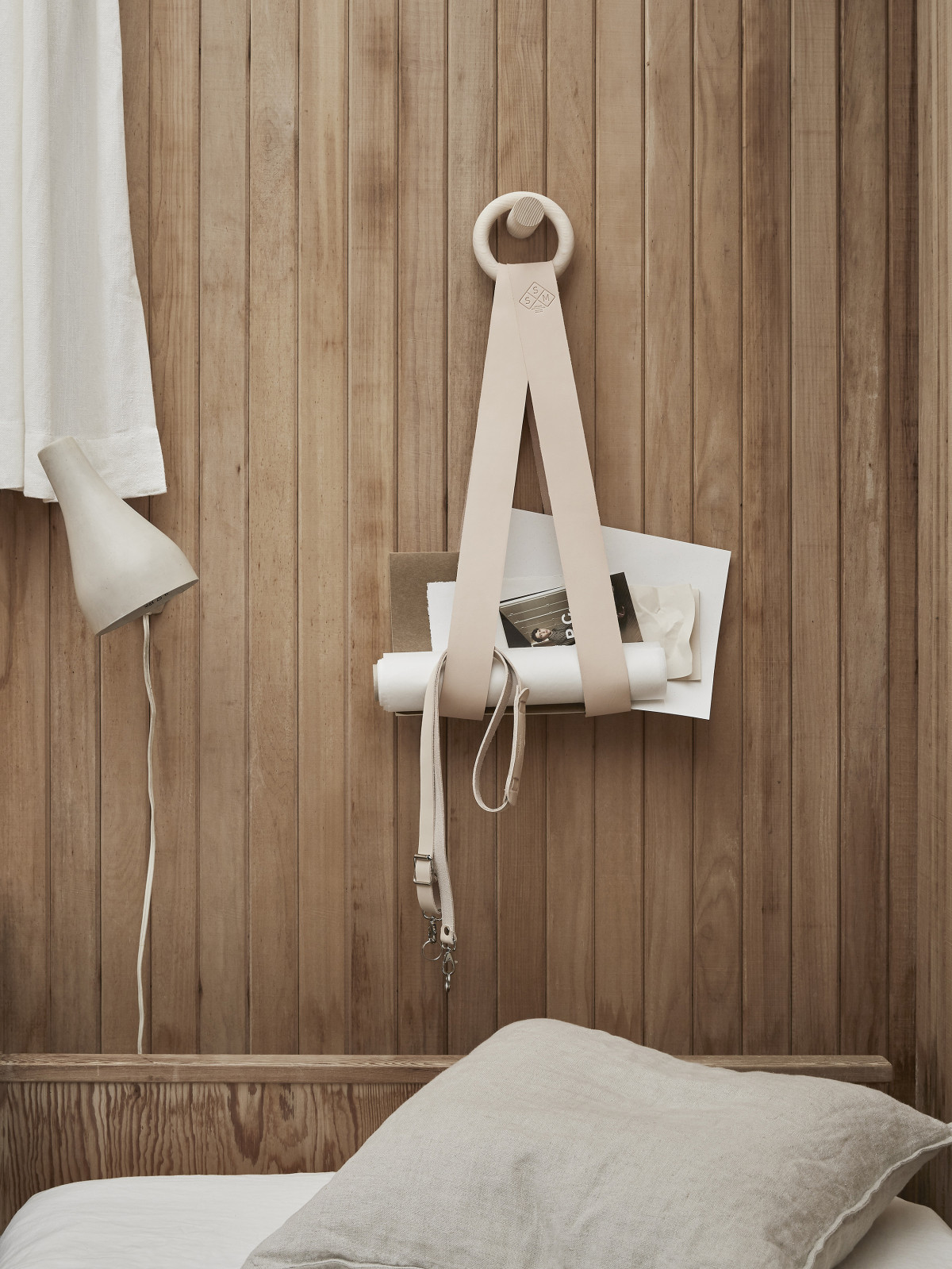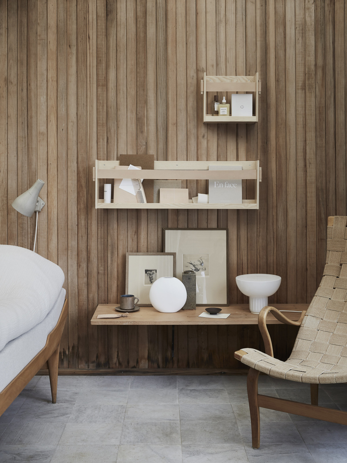 Ein Zeitungsbügel hängt über einem seltenen Doppelbett ‐ das letzte seiner Art. Hier trifft die neue Frische auf die schwedische Designgeschichte. Das zeitlose Handwerk, hauptsächlich aus Leder und Holz, ist langlebig und geschaffen für das Leben.