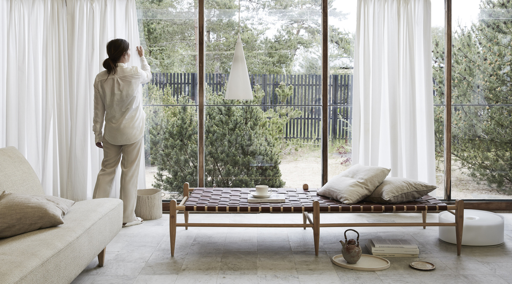 Während man durch das Haus wandelt, von einem Raum in den nächsten, legt sich eine Ruhe über dich. Räumliche Grenzen werden aufgelöst und das Innere des Hauses scheint fließend in die Natur überzugehen.