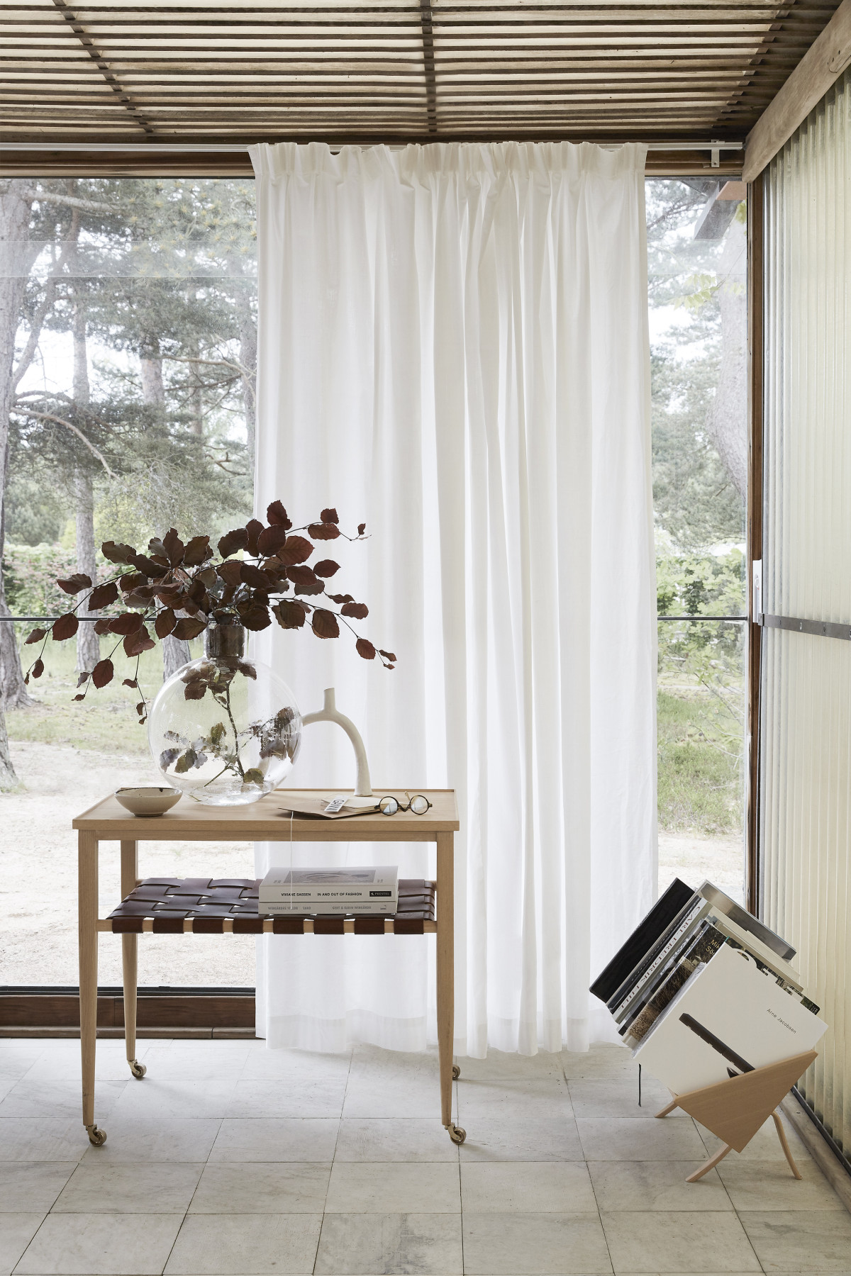 Feuchte Luft hängt über der Region Hallands. Eine Kiefer erstreckt sich über die Glasfront und fängt schüchtern die Sonnenstrahlen ein. Mitten in den Waldlandschaften und meilenweiten Sandstränden ruht ein Künstlertraum an der schwedischen Westküste, strategisch versteckt zwischen den Bäumen. Das bald 60 Jahre alte Haus gehörte dem ikonischen Möbeldesigner und Architekten Bruno Mathsson und seine Seele scheint immer noch hier zu verweilen.