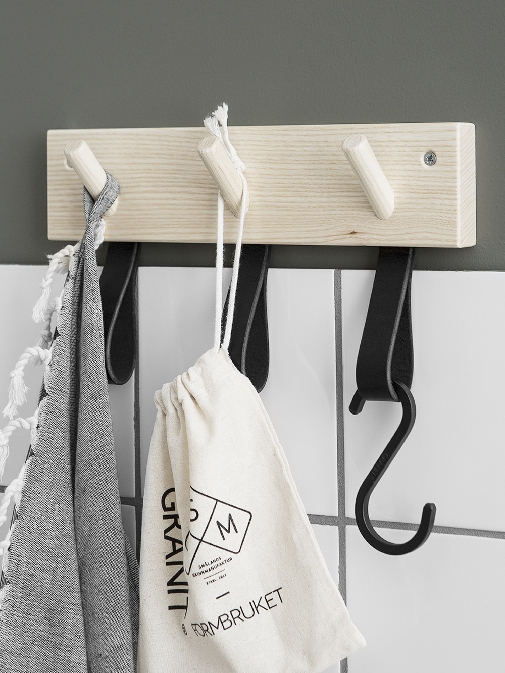 The collection is created for the kitchen and it´s a product family, from small wall hooks to larger furniture such as a bench and wall hanger. Everything is made of pure raw materials, ash and Tärnsjöläder and the production takes place in Småland.